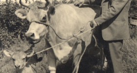 Mr Dick Ayres with prize cow and calf in 1933
